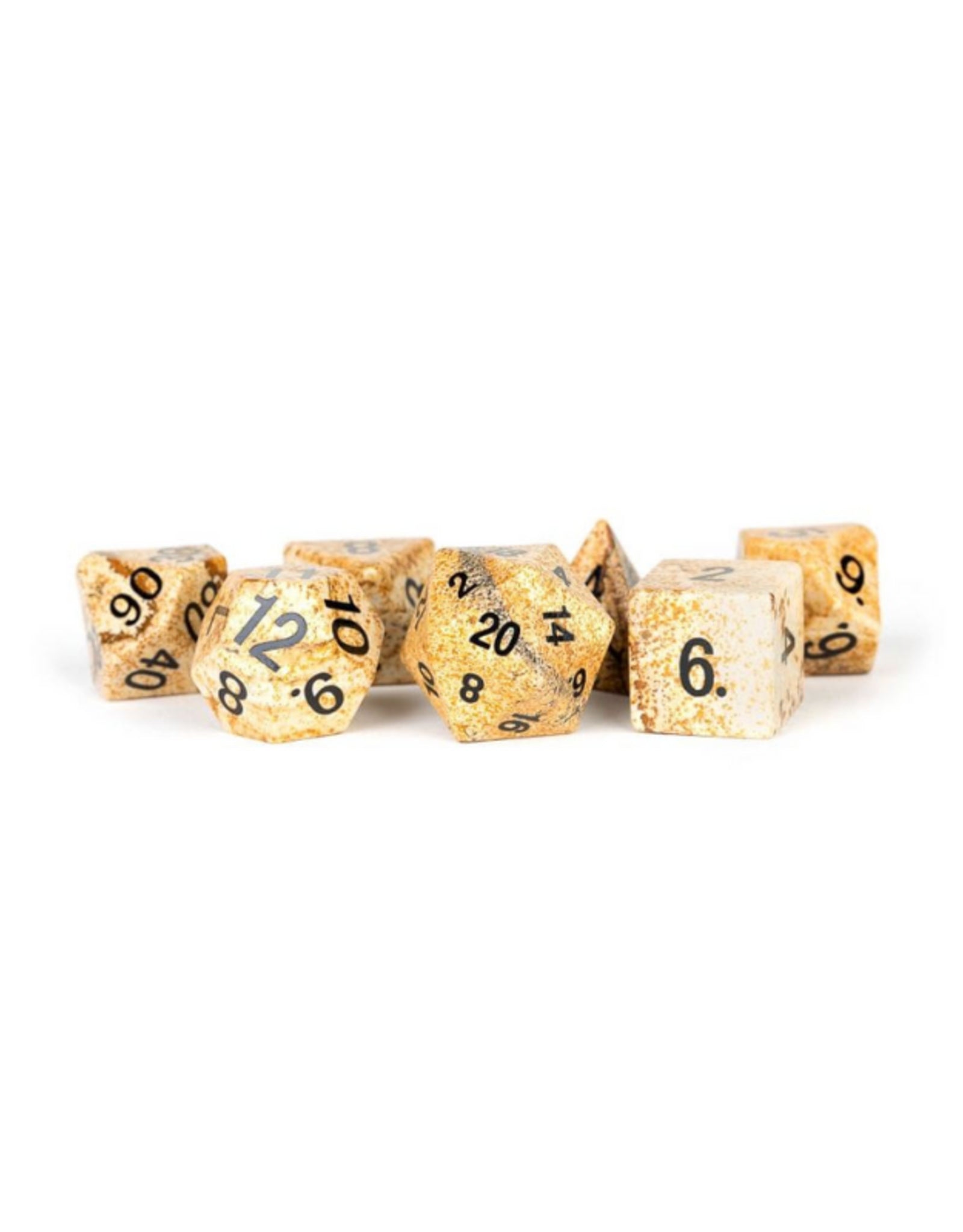 With their hefty feel and captivating looks, this gemstone dice set is the perfect upgrade for any gaming table. Also a great gift for your favorite gaming buddy. This is a full-sized engraved 16mm polyhedral dice set that comes with 7 dice (d4, d6, d8, d10, d10 (00-90), d12, and d20). Every gemstone set comes in a resin case that separates each die for protection.
