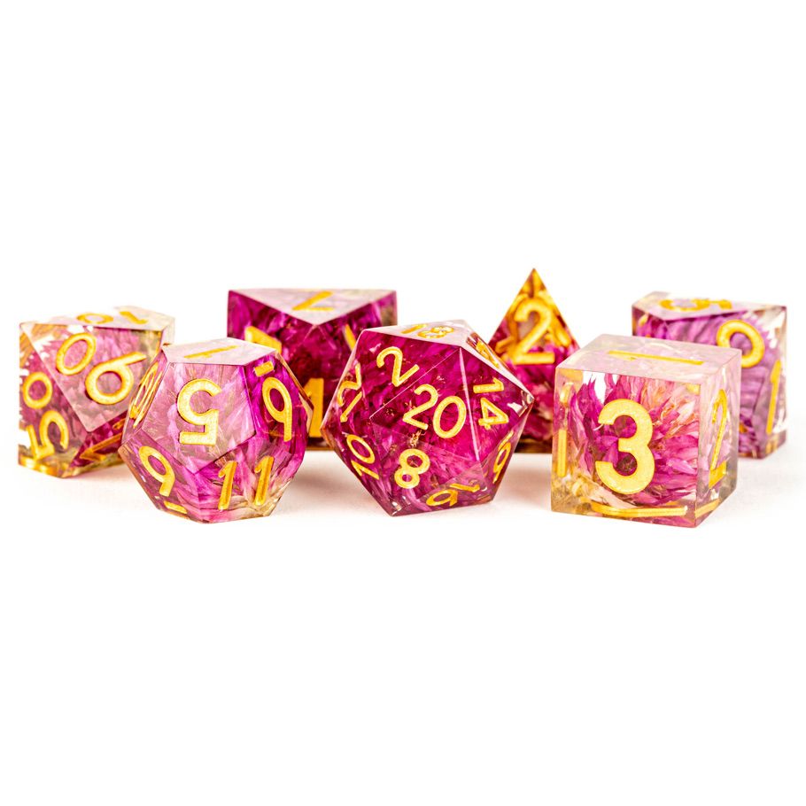 MDG sharp edge resin dice are handcrafted with beautiful inclusions. Unlike mass produced dice, MDG sharp edge dice are hand polished for precision rolls. Each full-sized set comes in a protective tin case and includes 7 dice (d4, d6, d8, d10, d10%, d12, and d20).