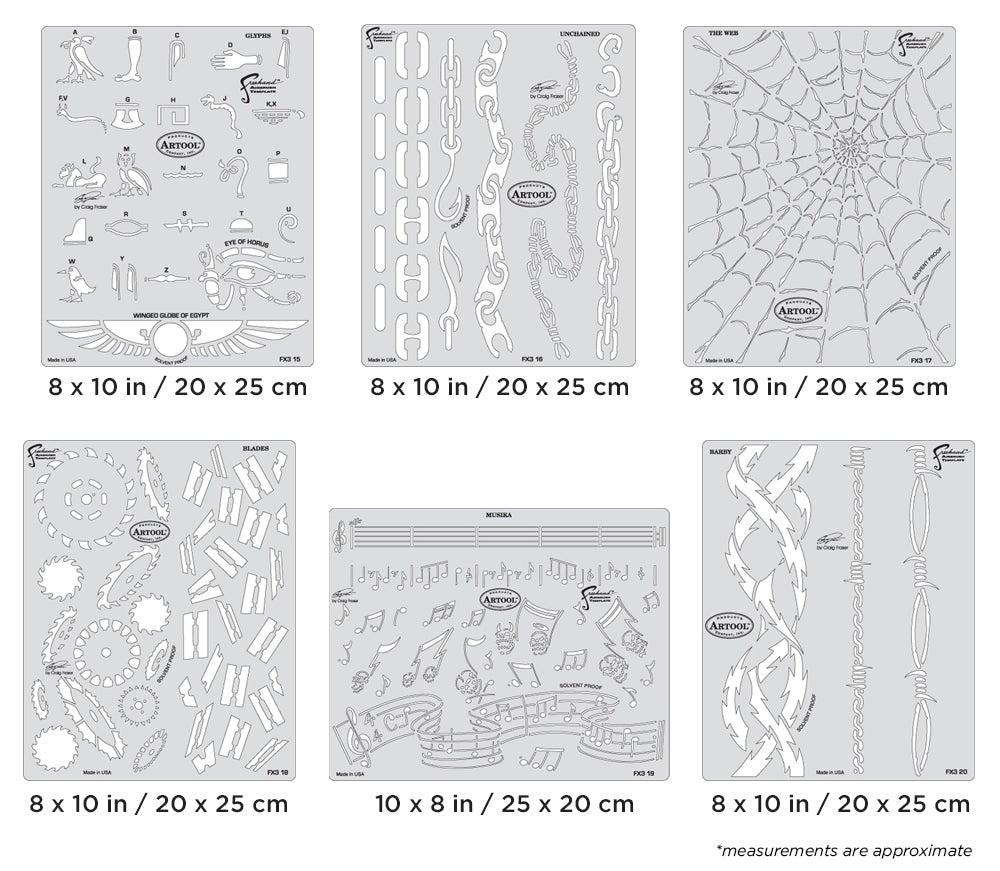 Artool FX3 Freehand Airbrush Set by Craig Fraser. Precision, laser cut templates for highly detailed effects. Solvent Proof mylar construction: great with both solvent and water based paints. Easy to clean. Create your favorite effects with Artool.