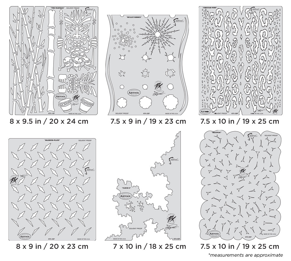Artool Kustom FX Freehand Airbrush Template Set by Craig Fraser. Precision, laser cut templates for highly detailed effects. Solvent Proof mylar construction: great with both solvent and water based paints. Easy to clean.