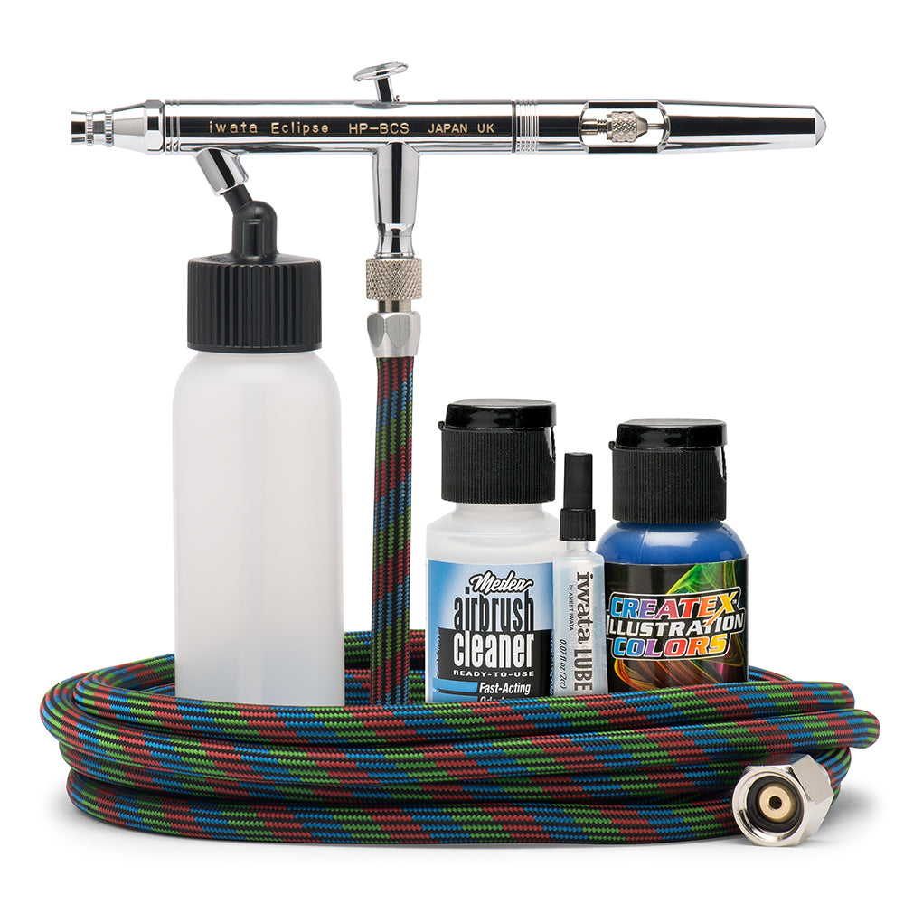 Iwata Eclipse Series airbrushes are known for their versatility. Eclipse's high flow allows it to atomize a wider variety of liquids with less need for reducing or thinning. Eclipse Series offers a broad spray range, as compared to other airbrushes, where it is possible to achieve a controlled fine line to controlled wide spray. Iwata Eclipse HP-BCS Siphon Feed Dual Action Airbrush comes with a 2 oz bottle and is a great choice for those who intend to use a larger volume of spray medium. One of the benefits of siphon feed airbrushes is that you can purchase additional bottles and prefill them with your favorite colors. This allows you to achieve quick color changes. Iwata Eclipse Series airbrushes feature an exclusive Compression Fit Nozzle that is easy to clean and assemble. The Quick-Flush Cutaway Handle allows easy access to the Needle so that you can quickly empty the paint reservoir for cleaning. Iwata's Spring-Steel Needle resists breakage and our needle packings are solvent resistant for longevity. Iwata Eclipse airbrushes come with an Eclipse Head Cap Spanner that is used to remove the Head Cap when accessing the Nozzle. Also included is Iwata Lube, which is used to lubricate the Needle and Main Lever mechanism. Hugely popular, Iwata Eclipse Series airbrushes offer all-star versatility. Set includes Iwata Airbrush Hose, Medea Airbrush Cleaner, Com-Art Acrylic Colour in Opaque Ultramarine, and Airbrush Users Guide. All-Star Versatility is one of the 5 Ways to Spray categories. Who sprays with All-Star Versatility? Makers and creators who... Spray with fine to wide level of detail and scale Want the ease of a drop-in nozzle Have beginner to high-level airbrush skills Use thin to thicker viscosity or pearlized spray materials Are hobbyist or professional painters Want to spray many types of things using one airbrush!
