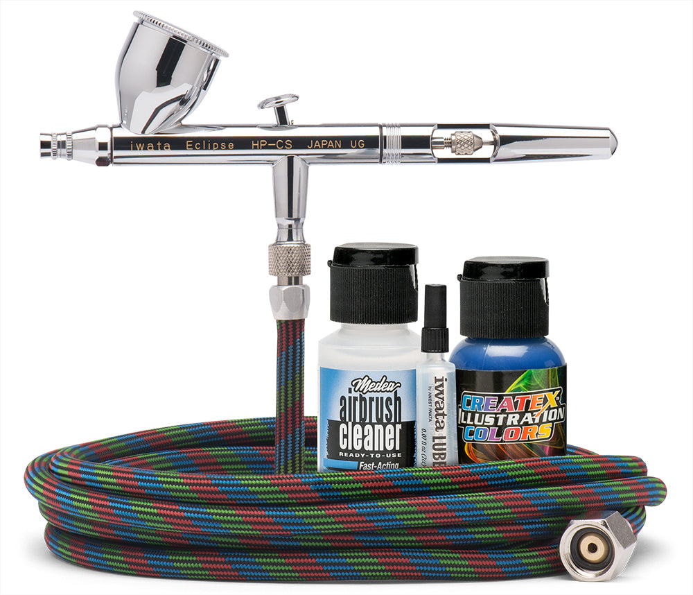 Iwata Eclipse Series airbrushes are known for their versatility. Eclipse's high flow allows it to atomize a wider variety of liquids with less need for reducing or thinning. Eclipse Series offers a broad spray range, as compaired to other airbrushes, where it is possible to achieve a controlled fine line to controlled wide spray. Iwata Eclipse HP-CS Gravity Feed Dual Action Airbrush has a generous 0.24 oz / 7 ml fluid cup with lid that is ideal for color mixing. Iwata Eclipse Series airbrushes offer an exclusive Compression Fit Nozzle that is durable and easy to assemble. The Quick-Flush Cutaway Handle allows easy access to the Needle so that you can quickly empty the paint reservoir for cleaning. Iwata's Spring-Steel Needle resists breakage and our Needle Packings are solvent resistant for longevity. Iwata Eclipse airbrushes come with an Eclipse Head Cap Spanner that is used to remove the Head Cap when accessing the Nozzle. Also included is Iwata Lube, which is used to lubricate the Needle and Main Lever mechanism. Hugely popular, Iwata Eclipse offers all-star versatility. The set includes Iwata Airbrush Hose, Medea Airbrush Cleaner, and Com-Art Acrylic Colour in Opaque Ultramarine and an Airbrush Users Guide. All-Star Versatility is one of the 5 Ways to Spray categories. Who sprays with All-Star Versatility? Makers and creators who... Spray with fine to wide level of detail and scale Want the ease of a drop-in nozzle Have beginner to high-level airbrush skills Use thin to thicker viscosity or pearlized spray materials Are hobbyist or professional painters Want to spray many types of things using one airbrush!