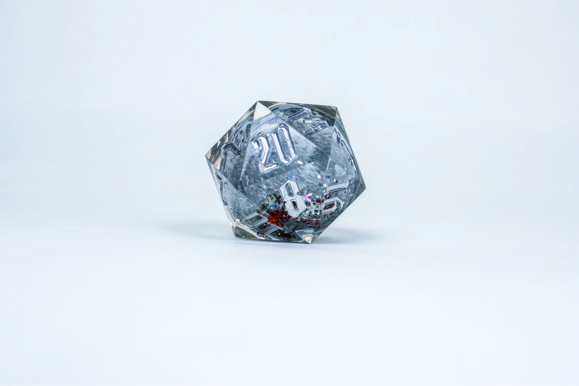 Brighten your holidays with this large D20 snow globe die. Shake it up or roll it and watch the red and green snowflakes float inside shimmering silver glitter