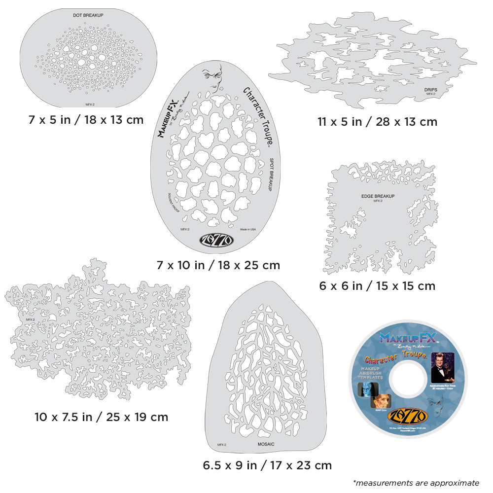 Zazzo Character Troupe Template Set by Bradley M. Look allows you to create character effects in special effects airbrushed makeup. You get 6 laser cut templates for use with water-based or solvent-based media to create amazing textures. It also comes with a 20 minute instructional DVD.